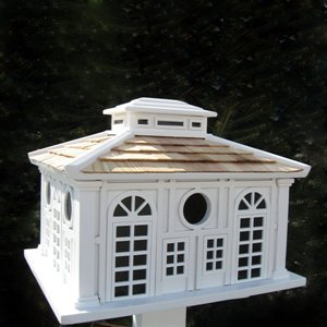 This functional birdhouse was inspired by a classic, English Conservatory style greenhouse. Squared corner columns, floor-to-ceiling windows, a removable back wall for easy cleaning and a 1 1/4" opening easily accommodate wrens, finches, chickadees, nuthatches and titmice. The house is constructed of exterior grade ply-board, pine shingles for the roof and poly-resin details. The finish is a non-toxic, outdoor paint. Item Dimensions: 8" H x 11" W x 9" D.